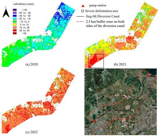 (a–c) Subsidence of resampled area B2 obtained by ascending SAR images. (d) The ESRI satellite imagery along the canal from Yanqi to Xiwengzhuang.