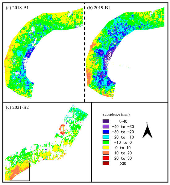 Subsidence obtained by descending SAR images. (a,b) Resampled area B1. (c) Resampled area B2.