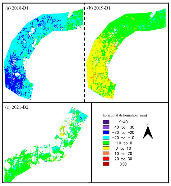 Horizontal deformation (east–west) obtained by ascending and descending SAR images. (a,b) Resampled area B1. (c) Resampled area B2.