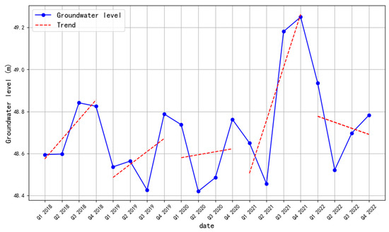 Some researchers have found that a decrease in groundwater level can lead to surface subsidence and deformation [39,40,41]. Figure 12 shows the quarterly average groundwater level changes along the Tundian to Niantou from 2018 to 2022. To explore the relationship between groundwater level changes and subsidence, we analyzed groundwater level changes within each year separately. It is clear that there was some uplift phenomenon along the canal from 2018 to 2021, and that the linear trend of groundwater level was upward in the first three quarters of each year. This may be due to the replacement of some groundwater extraction by water diversion projects [42]. In 2022, the linear trend of groundwater level decreases, with 94% of the areas along the route experiencing subsidence. To some extent, this phenomenon indicates a correlation between groundwater level and land subsidence. The rise of water level will exacerbate the ground uplift, while the fall of water level will exacerbate the ground subsidence. This view is consistent with some existing research [43,44,45].