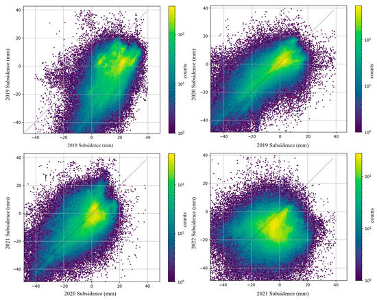 Next, a pixel-by-pixel comparison was performed on the distribution of the subsidence. We obtained the pixel-by-pixel comparison results of the Tundian to Niantou from 2018 to 2022, as shown in Figure 13. The subsidence results of 2019 and 2020 were evenly and symmetrically distributed on both sides of a straight line with a slope of 1, indicating similar subsidence conditions in the two years. In fact, the groundwater levels in these two years were close and had a consistent trend. Compared with 2020, the water level rise in 2021 increased by approximately 0.7 m. Of this area, a proportion of 7.3% experienced intensified uplift deformation. There were more pixels distributed between 20 and 40 mm in 2021. In the comparison of results between 2021 and 2022, the yellow core area was tilted towards 2021. This indicates that the subsidence situation was more severe in 2022, which is consistent with the changes in water level. The uplift phenomenon proportion reached 93% in 2018, but the water level rose only about 0.2 m. This may be due to lower water levels in previous years. The above results indicate some correlation between surface deformation and water level changes. Unfortunately, monitoring data along the route for 2017 and earlier were missing. Regular maintenance of the monitoring instruments should be intensified in the future.