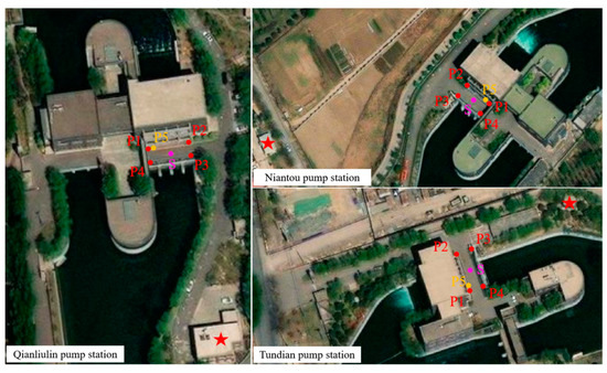 The ESRI satellite images of pumping stations. P1 to P4 are vertical monitoring points, P5 is horizontal monitoring point. S is the point for extracting InSAR deformation. Red star is reference point.