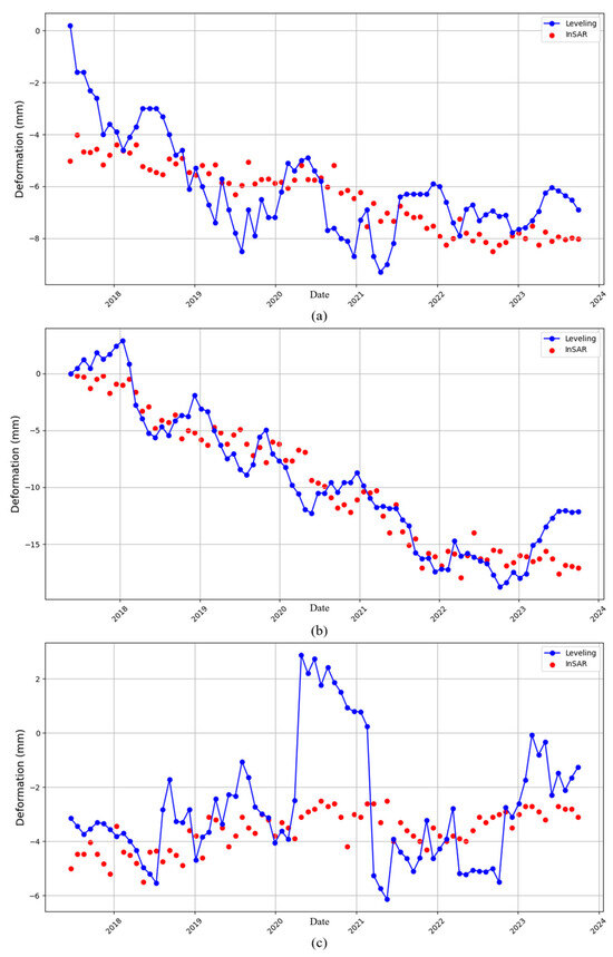 Comparison between InSAR results at point S and level measurement results. (a) Tundian pump station. (b) Qianliulin pump station. (c) Niantou pump station.