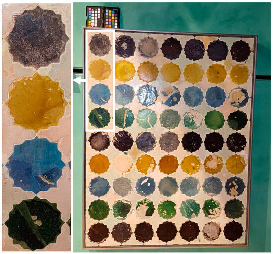 The tiled panel under study is a polychrome skirting made with a technique called zellige, in which a mosaic of glazed ceramic pieces, similar to tesserae, is created. In this case, its decorative geometric design is formed by sixteen-pointed stars, in different ranges of black, orange/yellow, blue, and green, linked by white crosses (see Figure 1). For this study, only the four (upper or bottom) half-stars (Figure 1, left column) that had been reintegrated were selected, one per hue.