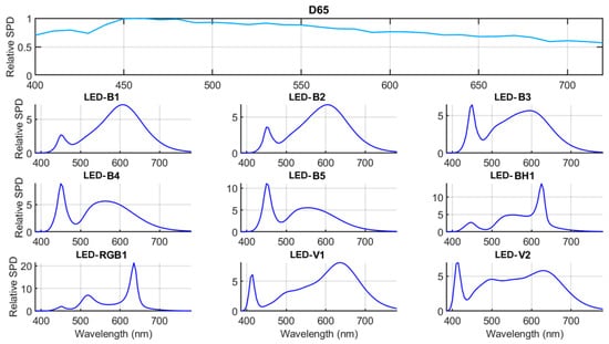 The nine LED illuminants recently proposed by CIE [11] depict the spectral profiles of white LED lamps based on the measurements of several commercial LEDs. These profiles were derived from empirical assessments of spectral power distributions obtained from 1298 commercially available white LED sources [23,24]. Figure 2 shows the spectral power distribution of the nine CIE LED illuminants together with the CIE standard D65 illuminant included in this study.