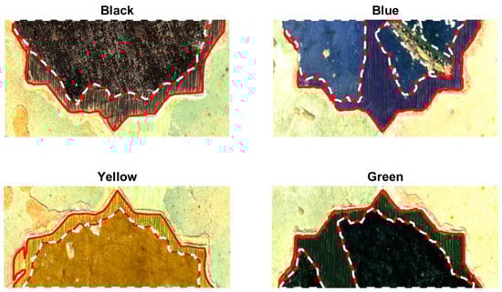 False RGB renderings of the black, blue, yellow, and green captured samples. The original and reintegrated areas are highlighted in dashed white and continuous red lines, respectively.