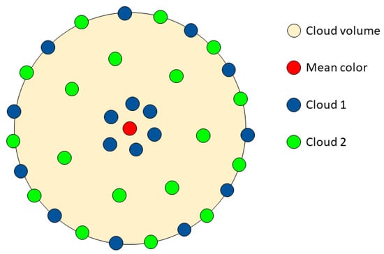 For the calculation of this parameter, we first compute the mean color. Then, we calculate the CIEDE2000 color difference of each point of the cloud in relation to the mean color. After this, we compute the mean value across all these color differences. A lower value of means that the inner distribution of points in the cloud is closer to the mean color (its center of gravity). However, larger values of the mean that the distribution of points is more spread out within the cloud volume. An example of the usefulness of the measurement can be seen in Figure 5.