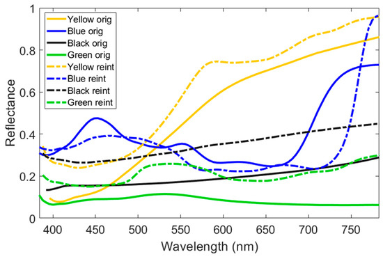 After the spectral reflectance images were obtained, the CIELAB color coordinates were calculated pixelwise under the ten studied illuminants, assuming the CIE 1931 standard colorimetric observer. Spectral information only in the visible range, from 380 to 780 nm, was used to perform the calculation, and the spectral data were interpolated in a 5 nm step. Hence, for the calculation of the color information, the spectral interval used was Δλ = 5 nm. In addition to this, different manually built binary masks are applied to retrieve the color information separately for the original and reintegrated areas. In this way, we can analyze both separately and compare the two. These binary masks are images for which the only possible pixel values are 1, meaning that the pixel belongs to a given class, and 0, meaning that the pixel does not belong to this class. Eight classes are built, representing the four hues studied—black, blue, green, and yellow—in the two conditions: original and reintegrated. Hence, 8 different binary masks were built.