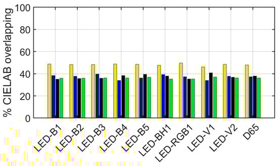 The overall overlap values obtained are not very high, between 34% and 50%, so that at a working distance it can be assumed that the original and reintegrated areas will be visually perceived as different, regardless of the tile and illuminant. The maximum value of overlapping volume (49.6%) is achieved for the yellow tile and the LED-RGB1 illuminant, while the minimum value (34.1%) is obtained for the blue tile with the LED-V1. Note in Figure 8 a similar trend for all tiles and illuminants, with the yellow tile providing the highest value of overlapping volume. In addition, the illuminant does not influence the overlapping volume greatly, with a maximum overlap difference of 5.7% between the LED-B3 and the LED-V1 for the blue tile.