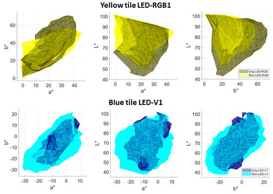 Finally, to evaluate and compare the color gamuts in the CIELAB color space across different tiles and illuminants, these are represented as solids using the alpha shape algorithm [32]. As an illustrative example, we selected the largest and smallest overlapping volumes and show their 2D projections in the a*b*, a*L*, and b*L* planes in Figure 9. This Figure provides a comparison between the color gamuts of the original (dark) and reintegrated (light) areas of the yellow (upper row) and blue (lower row) tiles for the LED-RGB1 and LED-V1 illuminants, respectively.