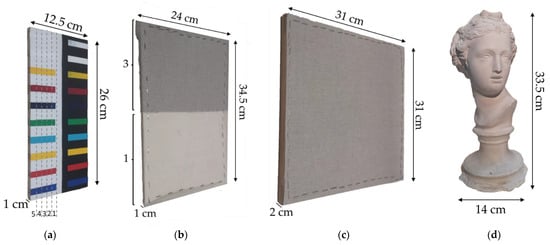 The acrylic paint mock-up consists of a wooden support (12.5 cm × 26 cm × 1 cm, Figure 1a), covered half in white and half in black base paint. Ten acrylic paints were applied to each half, and each paint was layered over five 1 cm2 adjacent areas by increasing the thickness (from 1 to 5) by about 50 µm each time. A complete characterisation of the latter can be found in ref. []. The canvas samples are labelled from 1 to 3 for increasing thickness: canvases 1 and 3 (thinnest and thickest) are mounted onto a wooden frame whose dimensions are 24 cm × 34.5 cm × 1 cm (Figure 1b), with canvas 2 (intermediate thickness) mounted onto a wooden frame 31 cm × 31 cm × 2 cm in size (Figure 1c). The plaster statue (with a base diameter of 14 cm and a height of 33.5 cm, Figure 1d) is a half-bust of a female figure.