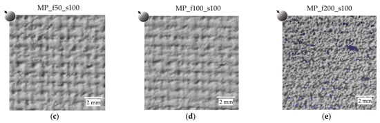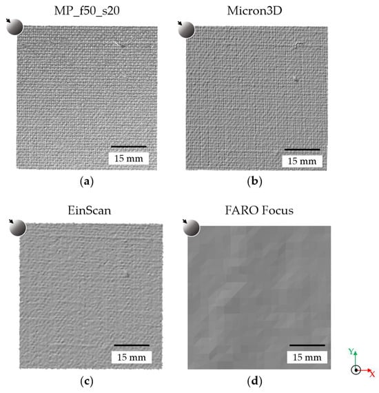 Concerning the micro-profilometer, the instrument performance varies with the focal length of the objective lens and the sampling step selected by the user. As an example, Figure 4 shows some meshes of sample canvas 2 generated by varying the latter characteristics. The meshes, shown in greyscale, were generated using the MeshLab software (v.2022.02 https://www.meshlab.net/ (accessed on 15 February 2024)) and choosing the same direction for the impinging light (from the top left) to highlight the features of the surface. Figure 4a,b display the models obtained with the 50 mm lens and sampling steps of 20 µm and 50 µm, respectively. The 50 mm focal length sets a spot size of a nearly 37 µm diameter; therefore, the 20 µm sampling step entails oversampling, which results in a clearer visualisation of the canvas warp and weft. A better lateral resolution is obtained at the expense of a significantly higher acquisition time: for the 60 × 60 mm2 area, the scanning time is 90 and 36 min for 20 µm and 50 µm, respectively.