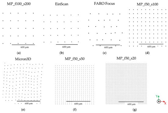 Point cloud details of sample canvas 2 generated by (a) 100 mm focal length and 200 µm sampling step (24 ± 2 pp/mm2); (b) EinScan scanner (27 ± 1 pp/mm2); (c) FARO Focus scanner (30 ± 3 pp/mm2); (d) 50 mm focal length and 100 µm sampling step (95 ± 7 pp/mm2); (e) MICRON3D scanner (145 ± 10 pp/mm2); (f) 50 mm focal length and 50 µm sampling step (375 ± 25 pp/mm2); (g) 50 mm focal length and 20 µm sampling step (2448 ± 178 pp/mm2).