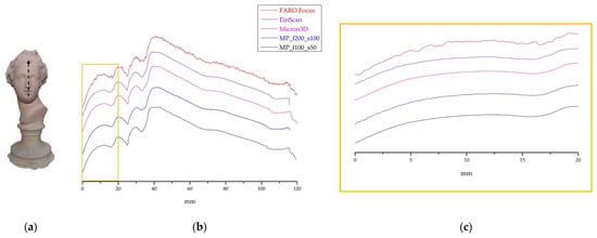 For profile evaluation, we imaged the plaster statue using FARO Focus, EinScan, MICRON3D and the MP equipped with 200 mm and 100 mm lenses. From the point clouds, we extracted a profile along the black dotted line in Figure 5a, following the arrow direction. As shown in Figure 5b, all the instruments can detect the shape of an object with a complex 3D geometry. The cloud collected with the FARO Focus is the noisiest, as the instrument is not designed for surveying small to medium-sized objects; concerning the micro-profilometer, MP_f200_s100 is noisier than MP_f100_s50 (Figure 5c). Therefore, whenever the object’s shape is within the dynamic range of the 100 mm lens (see Table 1), the latter should be preferred.