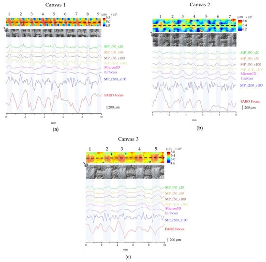 Neither of the structured-light systems (MICRON3D or EinScan) allowed us to identify the warp and weft in canvas 1 (Figure 6a), whereas both scanners detected the texture in canvases 2 and 3 (Figure 6b,c, respectively).