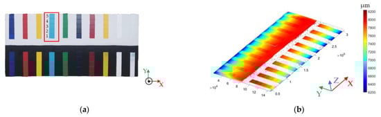 None of the instruments gave any results on black pigments, as can be seen in Figure 7b, which shows the colour map of the MP_f50_s50 point cloud, where the lack of points corresponds to the black area. For axial resolution computation, we selected the light blue pigment layered onto the white base (highlighted in red in Figure 7a). The wooden support warp, clearly visible in the colour map (Figure 7b), was removed by subtracting the second-order best-fitting curve from the raw data. The raw and conditioned surfaces from the MP_f50_s20 point cloud are shown in Figure 7c,d, respectively.