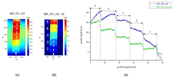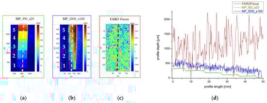 Since the objective focal length determines the axial resolution (besides the lateral one and the depth of field (DOF); see Table 1), we analysed the MP point cloud for each lens (50 mm, 100 mm and 200 mm focal lengths). Again, we used the MP_f50_s20 point cloud as a reference. As previously observed for the canvas samples, the signal-to-noise ratio for both the FARO Focus and MP_f200_s100 profiles does not allow us to detect any difference in the thickness of the five pigment areas (Figure 8b–d). FARO Focus does not even detect the deformation of the support: the surface appears to be flat (Figure 8c); therefore, no point cloud best fit was necessary.