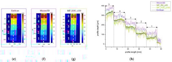 Conditioned surfaces of (a) MP_f50_s20, (b) MP_f200_s100, (e) EinScan, (f) MICRON3D and (g) MP_f200_s100 point clouds; (c) raw colour map of FARO Focus point cloud. The dotted arrows in (a), (b,c) indicate the direction of the extracted profiles plotted in (d), while the white dotted arrows in (a,e–g) indicate the direction of the extracted profiles plotted in (h).