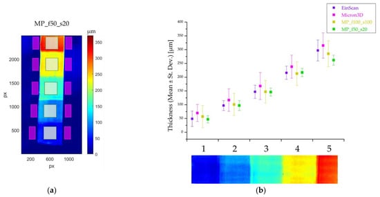 The EinScan, MICRON3D and MP_f100_s100 profiles show a step trend that allows us to measure all the paint thicknesses, enabling us to state that the instrument axial resolution is better than 50 µm (Figure 8e–h). MICRON3D overestimates the thicknesses of the acrylic layers, as its profiles are higher than the others.