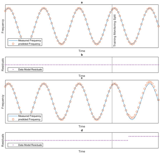 Concept schematic. Data model (a) with no abnormal behaviour. (b) residuals with no abnormal behaviour. (c) with abnormal behaviour. (d) residuals with abnormal behaviour.