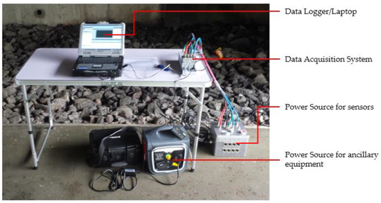 Modal tests on the four bridges were generally undertaken using the same methodology. The modal test generally consisted of placing wired accelerometers on the surface of the bridge and recording the deck acceleration during normal bridge operation. The accelerometers used to collect the data during the modal test were high-performance, solid-state sensors designed to measure low-level acceleration (noise level 0.00025 m/s2/√ Hz). The accelerometers’ signals were carried to the data logger, which was located away from the general public. Figure 6 shows the datalogger and all ancillary equipment used during the modal test.