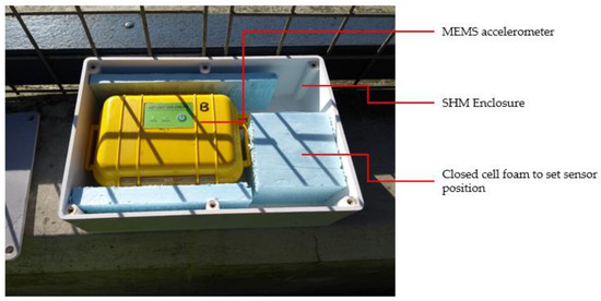 The SHM system used to obtain the long-term monitoring data consisted of one MEMS accelerometer and one environmental sensor. The accelerometer used was the ‘Multifunction Extended Life (MEL) Data Logger’ from Gulf Coast Data Concepts. This accelerometer measures acceleration in three axes within a range of ±2 g and has a real-time clock to timestamp every acceleration measurement. The acceleration data from the sensor are stored locally on an SD card at a sampling rate of 128 Hz, and the sensor is powered by an internal battery. The MEL accelerometer was housed in an enclosure that was in turn attached to the deck of each of the bridges. One of the enclosures can be seen in Figure 7.