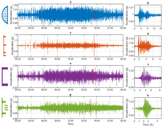 Typical acceleration data from the four monitored bridges are shown in Figure 8. Figure 8a shows acceleration data over 24 h for Bridge 1. Figure 8b shows the acceleration signal for a single-vehicle event that occurred during the 24 h (indicated by a red line in Figure 8a). Figure 8c,e,g show the acceleration signal collected from Bridges 2, 3, and 4, respectively, over the same 24 h period (as shown in Figure 8a). Figure 8d,f,h show a single-vehicle event within the 24 h from Bridges 2, 3, and 4, respectively (location marked with a red line in the corresponding 24 h plot).