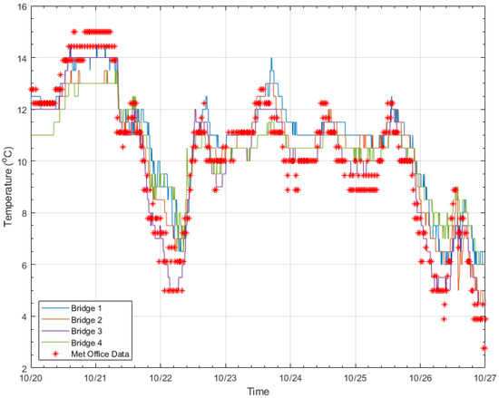 To ensure that the collected temperature data were sensible/credible, they were compared to data from a nearby weather station. This validation of the air temperature data is an important step, as the temperature data will be used as the main predictor in each of the data models used to predict the natural frequencies of the bridges. Figure 9 shows seven days of temperature data, with the blue, orange, purple, and green lines representing Bridges 1, 2, 3, and 4, respectively. Temperature data between each of the bridges are fairly consistent, albeit with slight differences, depending on the location of the bridge. The corresponding air temperature from the weather station is also plotted (red star markers). This met office weather station ranges from 11 to 14.5 miles from the four monitored bridges. The broad temperature trends at all four of the bridges match well with the met office air temperature. There are some small differences, e.g., for the hottest and the coldest temperatures, the met office temperature tends to be fractionally higher/lower, but this is likely due to the met office temperature being taken in a weather station, whereas the temperature at the bridges is taken close to a structure, which could account for the slight differences. Overall, the data presented in Figure 9 suggest that the air temperature readings collected from the long-term monitoring system are credible.