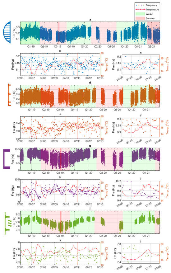 Example of natural frequency data from four bridges. (a,d,g,j) Natural frequency over 30 months; the summer and winter are indicated. (b,e,h,k) Natural frequency over 7 days and corresponding temperature. (c,f,i,l) Natural frequency over 1 day and corresponding temperature.