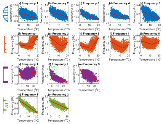 For Bridges 1, 3, and 4, the majority of the plots in Figure 11 show frequency and temperature having an inverse relationship, as expected. To highlight this fact, the best linear fit line is shown for each plot. It can be seen that most have a downward slope, indicating an inverse correlation. The first mode for Bridge 3 shows a slight positive correlation; however, the magnitude of the positive slope is quite small. In some modes, sub-zero temperatures cause a weak bilinear relationship between frequency and temperature. The mode where this is most obvious is mode 2 for Bridge 3; this is highlighted by the green dashed box in the top left of Figure 11i. This kind of bilinear behaviour around 0 °C is similar to that observed on the Z24 bridge [10] due to freezing events and is felt to be related to the effective stiffening of the deck when water in the deck/surfacing freezes.
