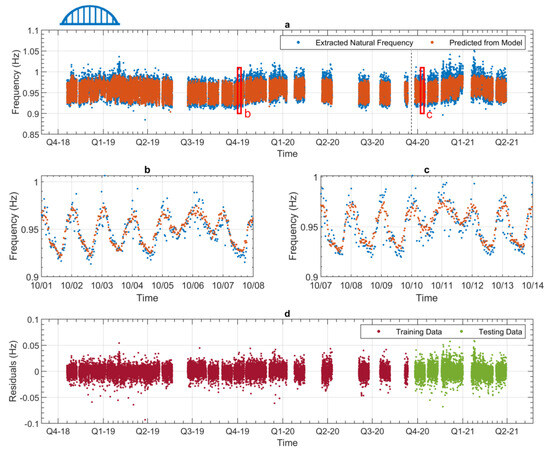 Figure 13 and Figure 14 can give us an indication of the performance of the data models. When studying these plots, we can look at how accurately the data models can predict the variations in the original data. In this case, our variations are the annual and daily changes to the natural frequency. Figure 13 and Figure 14 show that the performance of both data models presented is similar, i.e., that the variations in the data can be predicted in both cases. Figure 13a and Figure 14a show that the data models can accurately predict the annual trends of both frequencies. Figure 13b,c and Figure 14b,c show that the daily frequency trends are also accurately predicted by the models. Figure 13c and Figure 14c show that the testing data are of particular interest, as these plots show how well the data models can predict future behaviour. This is the case because the testing data have not been used in the training process, and so if the data model can predict the testing data, it should be able to predict future behaviour, which it also has not been trained on. It should be noted here that the performance of the testing data from both models is comparable to the training data. This indicates that the predictive power of the data models has been maximised [27]. Figure 13d and Figure 14d show the difference between the predicted values and the extracted values, i.e., the residuals. Viewing the residuals in this manner allows the comparison of model performance between the training and testing data. This figure indicates no periods of significantly better or worse prediction ability for either of the data models. As previously discussed in Section 4.3, the modes for Bridge 2 demonstrated some bimodal behaviour, depending on whether the temperature was above or below 13 °C. However, it can be seen in Figure 14 that the data model was able to account for this, as the residuals shown in Figure 14d are relatively consistent across the full monitoring period. Figure 13 and Figure 14 are representative of what the data models for the other modes look like, so to avoid repetition, only these two are shown here.
