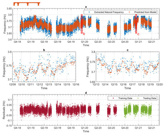 Results from a data model (Bridge 2—2nd frequency). (a) Full experimental dataset and corresponding values predicted by the regression model (divided into training and testing). (b) Zoomed-in view showing approximately 1 week of data during the training phase. (c) Zoomed-in view showing approximately 1 week of data during the testing phase. (d) Training and testing residuals across the whole monitoring period.
