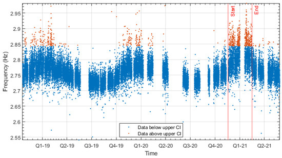 In this section, the discrepancy that was observed in Table 3 between the distributions of the training and testing residuals of mode 4 of Bridge 1 will be investigated. This can be seen both in the residuals of the data model and in the natural frequency data presented in Figure 15. This figure shows the fourth mode frequency for the entire monitoring period. To understand when the highest frequencies were observed, the data have been divided into two groups. The data higher than the upper 95% confidence interval are shown with the orange dots, and any frequency that is below the 95% confidence interval is shown with blue dots. The two vertical red lines in Figure 15 indicate the proportion of the testing data that caused the discrepancy in residuals/data, leading to the overall testing data being dissimilar to the training data. Using this plot, it can be observed that 60% of the highest frequency data (orange dots) are contained in this period, despite only accounting for 10% of the data. The fact that there is an increase in frequency in a discreet period followed by a return to normal behaviour indicates that it was likely due to a transient change in the environment as opposed to a change in the structure.