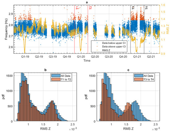 Knowing that the majority of the highest observed frequencies occurred during the period indicated in Figure 15, the next step was to determine if any other abnormalities were observed during this period. Figure 16 presents the results of that investigation. Figure 16a shows the same data that was presented in Figure 15, including an average of the vertical RMS acceleration shown with a yellow line. The vertical RMS acceleration measures the energy in the acceleration data and will be affected by the amount of traffic on the bridge. Three downward spikes are observed in the data, all occurring at the same period each year, namely, at the end of Q4 2018, 2019, and 2020. These sharp reductions in the vertical RMS values may result from the reduced traffic during the Christmas holiday period. This behaviour is as expected; however, a more prolonged drop in the RMS values can be seen in the period of interest in the testing data (between T3 and T4 lines). This drop does not occur due to a periodic event, like the observed downward spikes due to the reduced Christmas holiday traffic. To ensure that the drop in RMS values occurring between the T3 and T4 lines is abnormal, the same period during the previous year was used as a comparison. This comparison period is indicated between the T1 and T2 red lines in Figure 16a. Figure 16b,c show the histograms of the RMS values during these two periods. Figure 16b shows both the RMS values for all the data shown with the blue bar and the RMS values during the T1 to T2 period. Figure 16c again shows the RMS values for all the data shown with the blue bar and the RMS values during the T3 to T4 period. If these two plots are compared, it can be seen that the RMS values during the first periods (T1 and T2) match the distribution of the overall data, whereas the distribution of the RMS values during the second period (T3 and T4) show a significant reduction. Figure 16c shows that there was a reduction in the RMS values during the period of the testing data, which caused the discrepancy between the training and testing data. One possible reason has been given for a reduction in RMS values: a reduction in traffic, like that shown during the Christmas period. However, no such obvious event occurred during the period in question. It was observed during site visits that traffic control measures were in place around that time. These traffic measures restricted the speed of the traffic in one direction. The exact dates of the traffic control measures are unknown, so this is speculative, but a reduction in traffic speed could reduce the energy in the acceleration signal. The reduced energy could, in turn, lead to reduced accuracy in extracting the modal frequency.