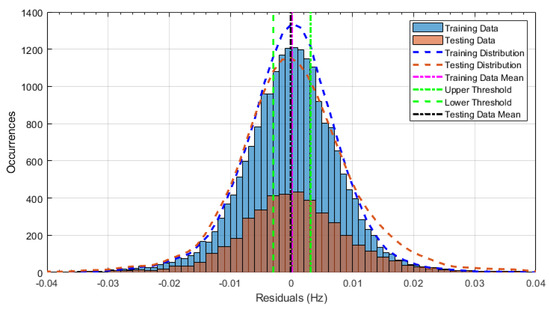 Explanation of the frequency shift detection method. Residuals from the data model training and testing with thresholds are marked.