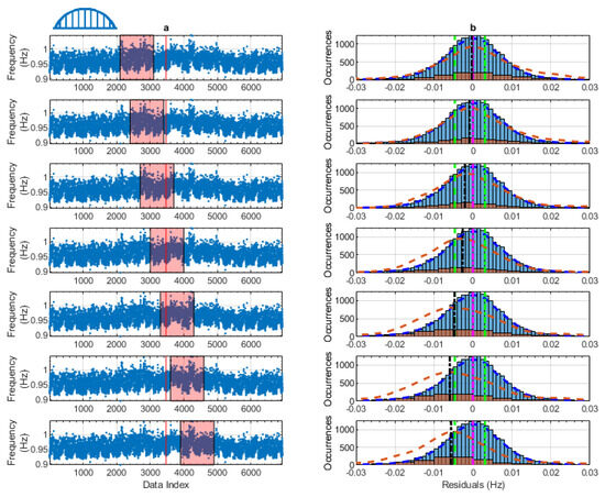 Figure 18 shows the process described on a sample of the testing residuals from the first mode of Bridge 1. The figure has been split into two columns, labelled ‘a’ and ‘b’. The data in column ‘a’ in the figure is the natural frequency measurements from the testing data (blue dots) after a frequency shift of −0.005 Hz is applied at the halfway point of the testing data (red line). The halfway point in the testing residual is indicated with a solid red line in column (a) in Figure 18. The plots in column ‘a’ show how the testing data were split with 1000 points of data within the red boxes. Column ‘b’ in Figure 18 shows the data contained in each of the corresponding red boxes. These plots are in the same format as Figure 17. Testing of each of the data windows is undertaken in the same manner described above; the frequency shift is detected if the testing residuals’ mean (black dashed-dot line) is outside the threshold values (two green lines). In the figure, it can be observed that the first four windows (top four rows) do not detect a frequency shift. This is expected, as these four windows contain data from before the frequency shift was introduced. In the last three windows, the mean of the testing data is beyond the threshold values, indicating that the frequency shift has been detected. The two conditions stated in Section 7.3 have been met, meaning that this data model can detect a frequency shift of 0.005 Hz. For presentation purposes, only the middle windows are shown (seven windows at the start have been omitted and six at the end).