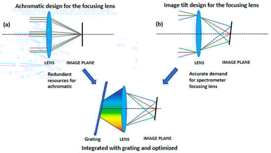 It can be seen that the chromatic aberration correction demand for the spectrometer focusing lens is not the same as imaging lens. The focusing lens just needs to image the diffracted light of different wavelength with corresponding angle to a specific position on the image plane, and apochromatism to approximately 0 in the whole spectral range is not necessary for the focusing lens design. Therefore, the image plane tilt can be set actively during the focusing lens design process, and this will reduce the achromatism demand and simplify the design of a high NA focusing lens. The schematic diagram of the difference between the two design process is shown in Figure 1.