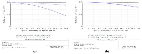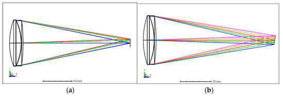 We designed a basic chromatic doublet using conventional achromatism and the image plane tilt method, respectively, to demonstrate the principle illustrated above. The doublet is composed of a BK7 plus lens and a SF2 minus lens, and the aperture is 15 mm, the focal length is 40 mm, the FOV is ±2°, and the spectral range is 400–1000 nm. The optical layouts of the designed doublets are shown in Figure 2, and the Modulation Transfer Function (MTF) and spot diagram are shown in Figure 3 and Figure 4. The parameters of the 2 doublets are shown in Table 1.