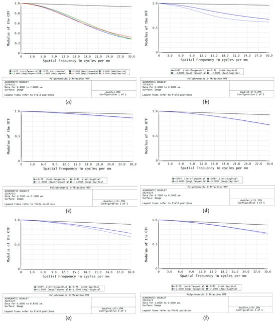 The MTF of the designed two doublets. (a) MTF of the achromatic doublet. (b–f) MTF of the doublet with image plane tilt: (b) is for −2° FOV and 0.4 μm wavelength; (c) is for −1° FOV and 0.55 μm wavelength; (d) is for 0° FOV and 0.7 μm wavelength; (e) is for 1° FOV and 0.85 μm wavelength; (f) is for 2° FOV and 1 μm wavelength.
