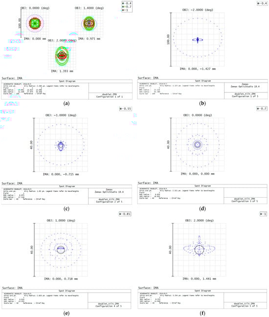The spot diagram of the designed two doublets. (a) Spot diagram of the achromatic doublet. (b–f) Spot diagrams of the doublet with image plane tilt; (b) is the spot diagram of 0.4 μm and −2° FOV, (c) is the spot diagram of 0.55 μm and −1° FOV, (d) is the spot diagram of 0.7 μm and 0° FOV, (e) is the spot diagram of 0.85 μm and 1° FOV, (f) is the spot diagram of 1 μm and 2° FOV.