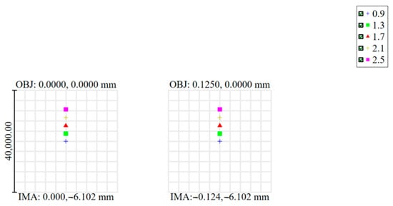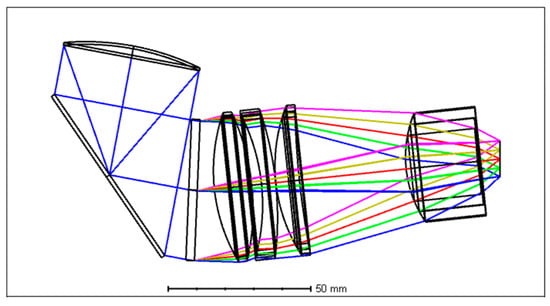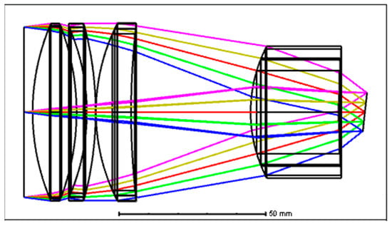 Since the Petzval lens configuration has the characteristics of large relative aperture and small FOV, it is suitable for the design requirements of the focusing lens. As for designing the focusing lens, in addition to following the conventional Petzval objective lens design optimization process, according to the design simplification method described in the previous section, the focal plane is set tilted, and the Zemax multi-configuration function is used to set each lens FOV to only image its corresponding wavelength light on the image plane, and the FOV angle has a linear relationship with the wavelength . For optical materials, as the achromatic correction demand is reduced, the ZnSe and Silica with high transmission in the 900–2500 nm spectral range and good physical performance are used to simply correct the chromatic focal plane shift to a certain linear distribution. And another same material doublet is added close to the image plane as field lens to correct the residual spherical aberration and comma; meanwhile, the field curvature and astigmatism can also be corrected.