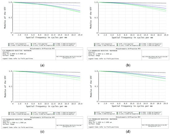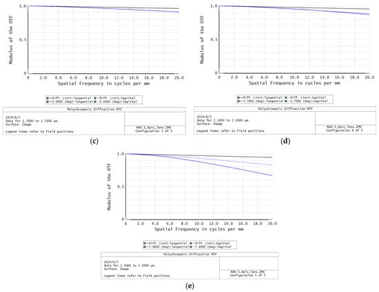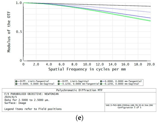 The MTF of the designed spectrometer focusing lens. (a–e) MTF of the designed focusing lens with image plane tilt: (a) is for −7.4° FOV and 900 nm wavelength; (b) is for −3.7° FOV and 1300 nm wavelength; (c) is for 0° FOV and 1700 nm wavelength; (d) is for 3.7° FOV and 2100 nm wavelength; (e) is for 7.4° FOV and 2500 nm wavelength.