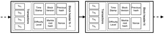 Figure 1 presents an example of a block structure in a generic blockchain. A block is divided into two parts: one for the transactions and the other for the header. The number of transactions varies per block, ranging from dozens to hundreds depending on the blockchain technology used; these numbers are represented by to in Figure 1. The header records the information about the block and its history in the chain. Thus, it is divided into the following fields: previous hash, which carries the hash of the entire originating block (block ) for the current block (block N), thereby maintaining the order of the blocks within the chain; the block version indicates a set of rules for block validation; the Merkle tree contains a hash of the root of the Merkle tree of this block’s transactions; the difficulty level represents the effort required to mine the block; the nonce is a random value determined by miners to solve the consensus algorithm problem; and the timestamp records the creation time of the current block [49].