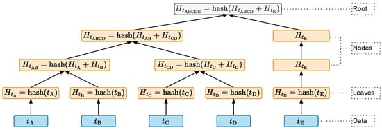 A block added to a blockchain undergoes a process called mining, which involves validating the transactions and the structure of the header. However, to be mined, a block must contain transactions (or data) tied to that block. These transactions are sent through the nodes of the blockchain’s peer-to-peer network. Storing all the transactions from multiple blocks would lead to high storage costs for blockchain technology; thus, to address this, a summary of all the transactions within the block is created using a Merkle tree, as found in the block’s header shown in Figure 1. A Merkle tree is a data structure used to summarize and verify the integrity of a large dataset using hash functions [49]. There are various types of hash algorithms; however, SHA-256 is commonly used, as mentioned in [42,48,50,51]. Figure 2 illustrates the organization of the tree, with the root hash at the top, the hashes of the nodes immediately below, which receive the hashes of the data or transactions (, , , , ), are displayed on each branch by the respective hashes (, , , , and ), and calculated by concatenating them in pairs or singly if the total number of transactions per block is odd.
