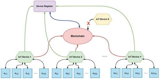 Figure 3 illustrates an example of blockchain technology application in a network of P IoT devices, where each p-th device is connected to sensors, with representing the v-th sensor connected to the p-th device. Figure 3 depicts a device registrar and the blockchain itself. The figure shows P IoT devices (in green), which are part of a valid network, their sensors (in blue), and one unauthenticated device (in yellow). The initial stage of communication occurs when the IoT devices are registered with a registrar, as shown in Figure 3 by the green arrows. Consequently, only authenticated IoT devices can participate in the blockchain. An authentication and authorization process is essential for these devices to transmit transactions on the blockchain. This process serves as a verification mechanism to ensure that only previously registered IoT devices can share blocks and transactions, thus preventing maliciously added devices (depicted in yellow) from launching attacks or otherwise disrupting the proper use of the technology. The blue arrow represents this process in Figure 3. For example, as discussed in [42], a blockchain API gateway is employed for these authentication and authorization functions to facilitate secure interactions with the blockchain. In contrast, [40] utilizes a certification authority (CA) and a verifier control center (VCC) for similar purposes. Furthermore, Ref. [53] describes the use of a certification center to certify the regional nodes (similar to the IoT devices shown in Figure 3) and manufacturers, with each regional node maintaining comprehensive records about the devices, manufacturers, and their permissions within the blockchain.