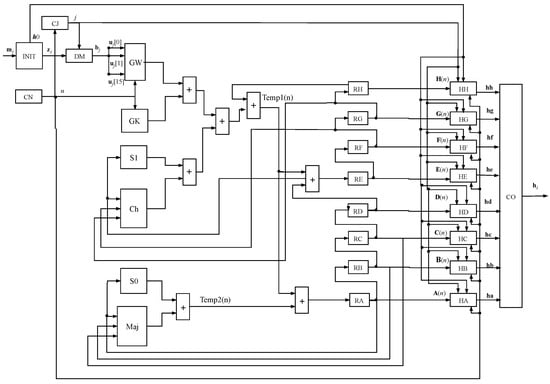 Furthermore, Figure 4 illustrates the direction of signals (or variables) among the datapath components, starting from the INIT module and moving through the registers , , , , , , , and . These signals represent the hash initialization function, as indicated in line 6 of Algorithm 1.