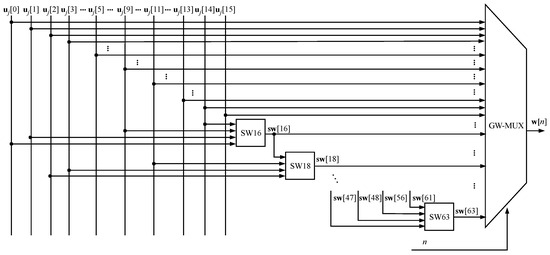 The design was developed to perform the operations presented in Algorithm 1. The first step in the signal flow occurs with the input of the i-th message in the module, which executes the extension processes operations (lines 1–5) and hash initialization of the hash values (line 6) from Algorithm 1. The DM module performs the message split function, which divides the message into blocks, (line 8 from Algorithm 1), according to Equation (3). In turn, these blocks are split into 16 32-bit words, , (Equation (3)), which are the inputs to the GW module, shown in Figure 5. This module is responsible for expanding the message to 64 words, expressed by Equation (8). Another input for both this module and the GK (which stores the values of the vector ) is the output of the CN module, a 6-bit counter (ranging from 0 to 63) referring to the lines 11 and 16 of Algorithm 1. The CJ counter acts on the loop control described by line 7 of the same algorithm.