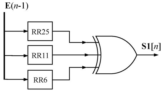 The modules S1, Ch, S0, and Maj correspond to the implementations of Equations (9), (10), (11), and (12) respectively, which utilize 32-bit logic gates. In Figure 6, the implemented structure of the S1 module is visible, featuring a three-input XOR gate. The RR module can also be found in the figure, consisting of logic gates that perform the right-rotate operation, as described in Equation (7).