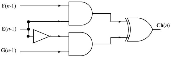In Figure 7, it is possible to visualize the structure of the Ch module that uses two logic gates, one , and one inverter () (Equation (10)).