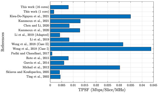 where means the number of elements (slices), the maximum clock frequency of the reference works, and and are the number of elements (or slices) and the maximum clock frequency in this work, respectively [59].